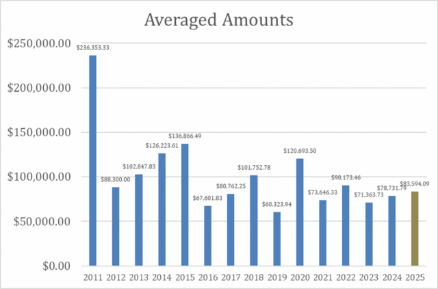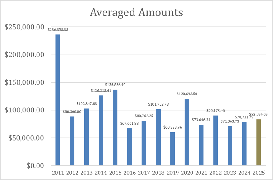 This year, in addition to the records described above, we note that the average settlement number $83,594.09 in 2025 is well within the range that we have seen in recent years, as reflected in the chart below. Indeed, this is very close to the 2021 and 2024 averages, suggesting that the range of settlements appear to continue to converge (though we recognize that a settlement number is fact-dependent, and these averages may just be coincidental based on specific submissions).