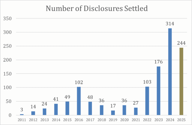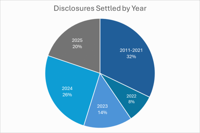 The Disclosures settled by year further demonstrates the pace CMS has maintained in processing disclosures post-Covid. In the last two years, CMS has settled nearly half of all disclosures since 2011. The last four years represent 67.8% of all settlements, and 63.7% of the settlement dollars. On the other hand, the slight decrease compared to 2024 ends a three-year trend where CMS settled more disclosures year-over-year.