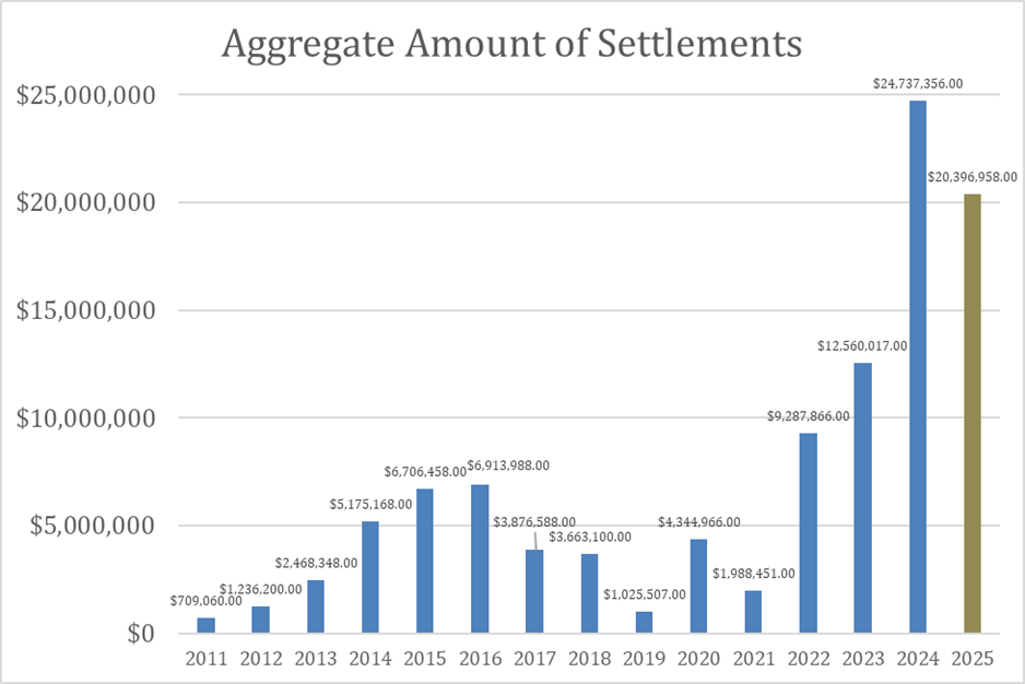 Second, the record-high individual settlement of $2,683,066 in 2025 is a notable development. This eclipses the prior record of $1,196,188 from 2018 by more than double and serves as a reminder that settlement amounts remain highly fact-dependent. A number of factors may contribute to the exact numeric value of a specific settlement, and one or two outliers with very high or low settlement values can skew the average settlement amount. Indeed, the lowest settlement last year was $2.